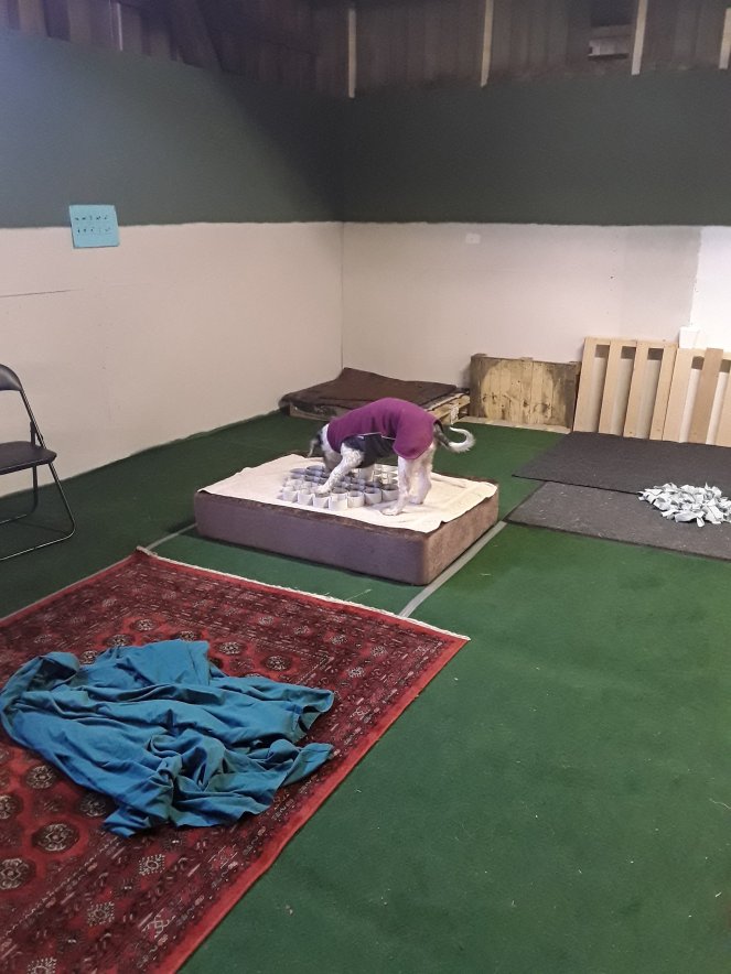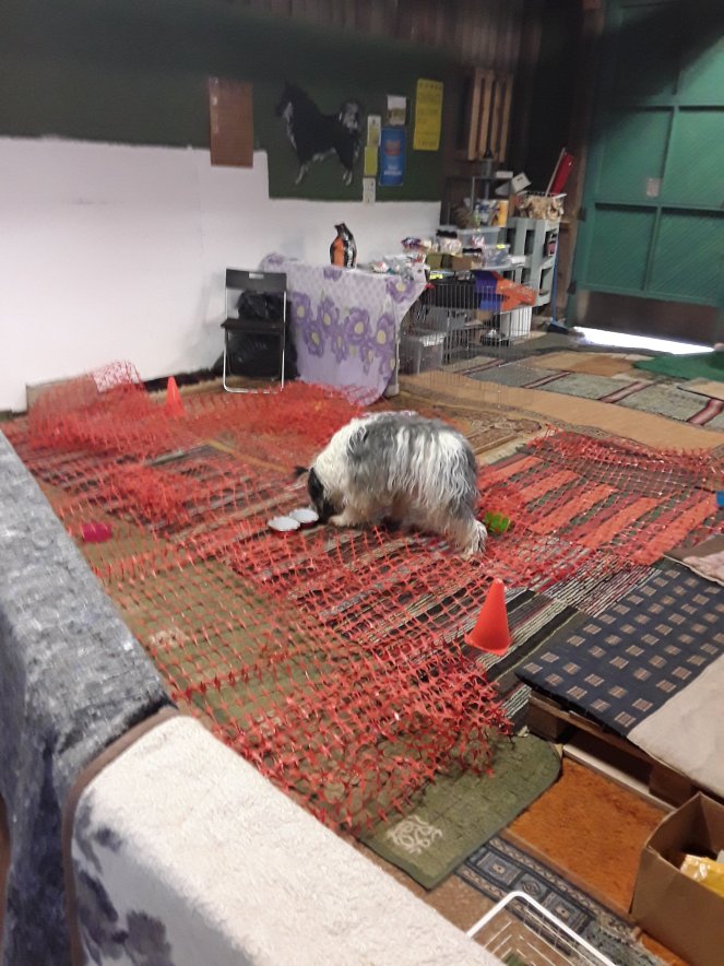 Olen käynyt koirien kanssa siellä muutamia kertoja, kaikki koirat tykkäävät radasta hirveästi. Radalla tulevat myös hauskasti esiin koirien erilaiset luonteet ja tyylit toimia. Tiuhti 6v on rataillut muutamia kertoja. Tiuhdin tyyli on käydä yksi alue kerrallaan tarkasti läpi, siltä ei jää varmaan yhtäkään namia huomaamatta. Tiuhti ei puolessa tunnissa ehdikään kuin haravoida ehkä 2/3 hallista. Tiuhti on myös aika varovainen, se ei mielellään suinpäin säntää uusille alustoille, vaikkakin on nyt kerta kerralta rohkaistunut.