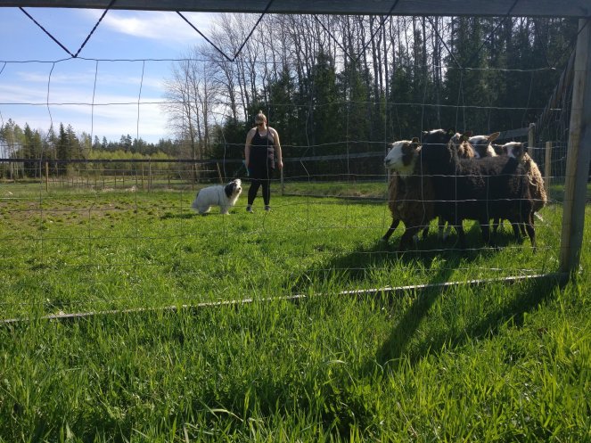 Varasin jo vuodenvaihteessa kaikille kolmelle paimennuksen Woollandiassa maaliskuussa. Vielä samana aamuna mietin, mitäköhän Tellulla mahtaa touhusta tulla ja kannattaisiko se vain jättää kotiin. Onneksi en jättänyt, koska maatilalla Tellu osoittautui olevan elementissään! Se ei jännittänyt siellä mitään asioita eikä pelännyt yhtään lampaita. Olemme nyt käyneet kolmean eri kertana Woollandiassa ja Karjataidon tilalla, Tellu on ollut lampailla yhteensä 8 kertaa. Se on lampaista kiinnostunut ja on saanut kehuja kouluttajilta, mutta itsevarmuuden puutteessa se ei erkane minusta kovinkaan kauas.