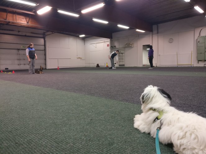 Nyt kun Susulla alkoi juoksut, on Tellu päässyt treenailemaan tokoa sen tilalle. Maanantaina ja tiistaina olimme Tuijan koirakoulussa tokotreeneissä. Tellu on hirveän kiinnostunut muista koirista ja häiriintyy herkästi niiden aiheuttamista äänistä jääden tuijottelemaan kavereita, joten edelleen iso osa tunnista menee ihan pelkän kontaktin palkkailuun. Kerta kerralta Tellu kuitenkin jaksaa keskittyä paremmin ja reagoi ääniin vähemmän, eli hyvään suuntaan ollaan menossa.