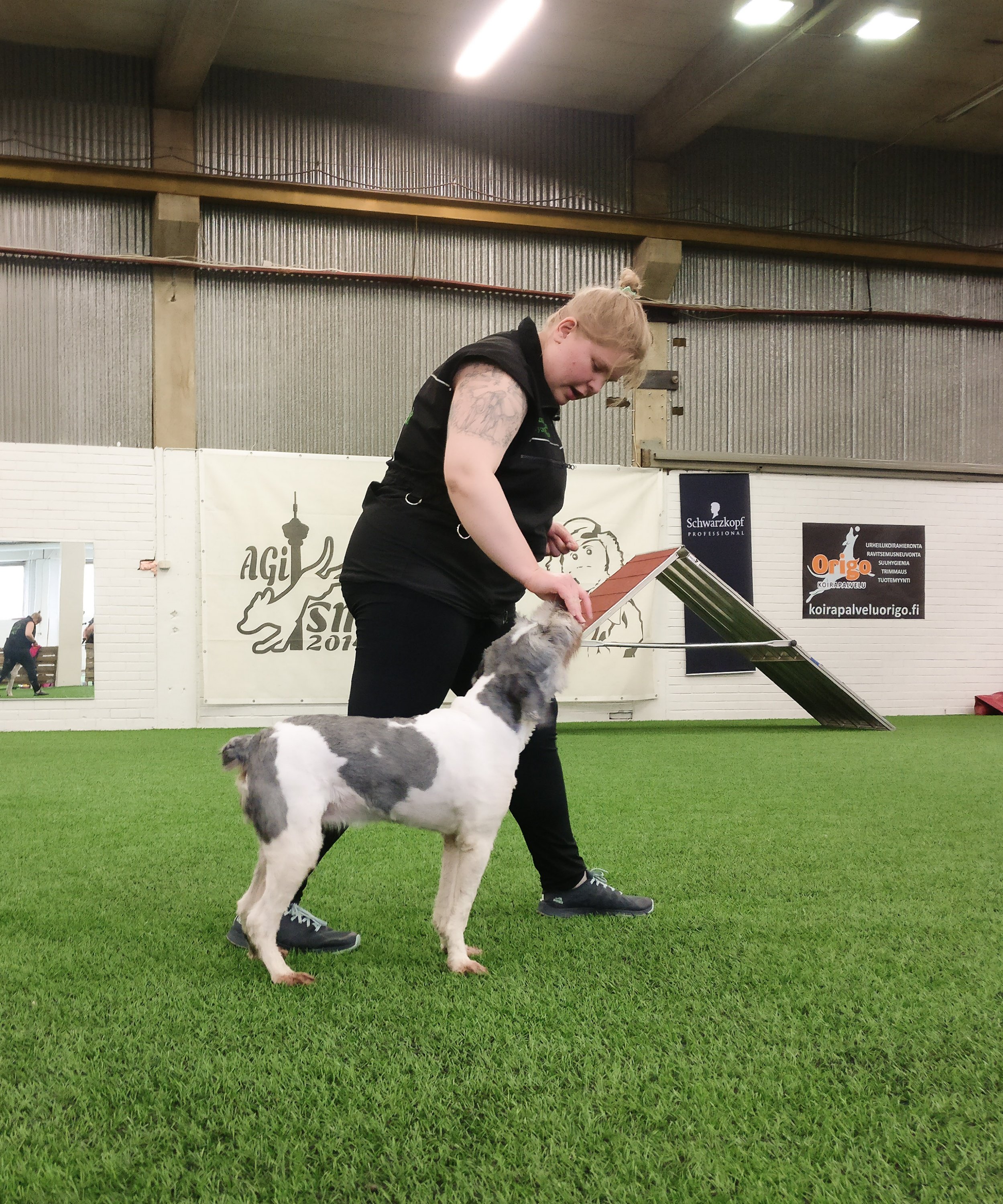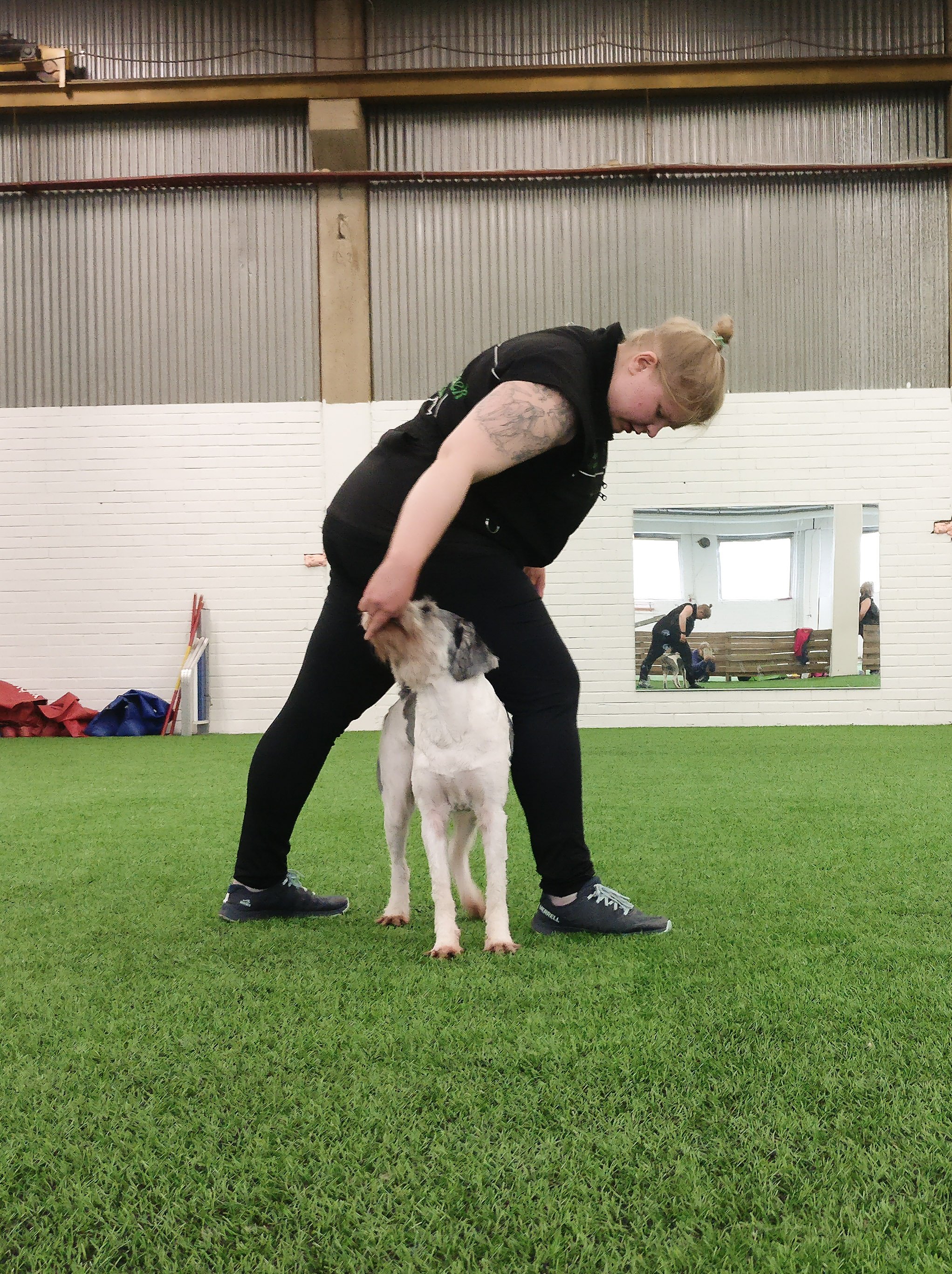 Nopeasti laskettuna siis 67 erilaista vihjettä! Näiden lisäksi lajien välisiä eroja on luotu varusteilla, eli canicrossia varten on vetovaljaat, omaehtoiselle lenkille mennään pitkässä liinassa, nose workiin on samoin omat valjaat ja muita lajeja tehdään ohuessa pannassa tai ilman varusteita. Kisapalkkaan on oma rutiini, samoin treeneihin ja kisapaikalle saavuttaessa. Myös treenien lopetukseen on luotu rutiini vihjeeksi siihen, että enää ei tehdä, jolloin koira voi rentoutua ja lopettaa odottamisen, jos vielä pääsisi. Samalla estetään se, ettei tavaroiden keräämisestä muodostu vahingossa rangaistusta palkkion poiston muodossa, kun koiralta viedään mahdollisuus suorittaa mieluisia tehtäviä ja ansaita palkkioita.